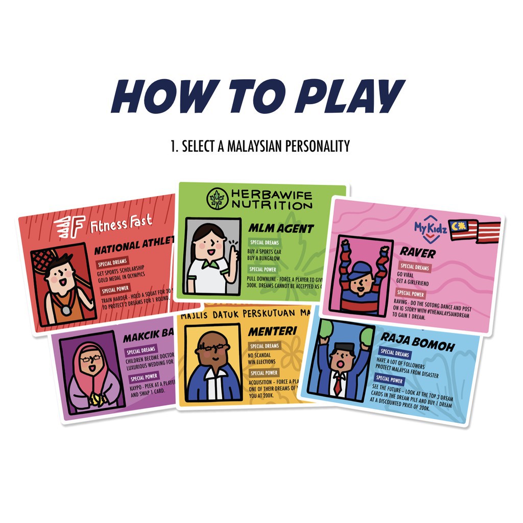 On each turn draw 2 action cards and play up to 3 actions 3. You start the game as a Malaysian personality such as a Menteri Mak Cik Bawang Raja Bomoh National Athlete or MLM Agent. Keep going until all Dream Cards run out the player with the most number of Dreams wins.